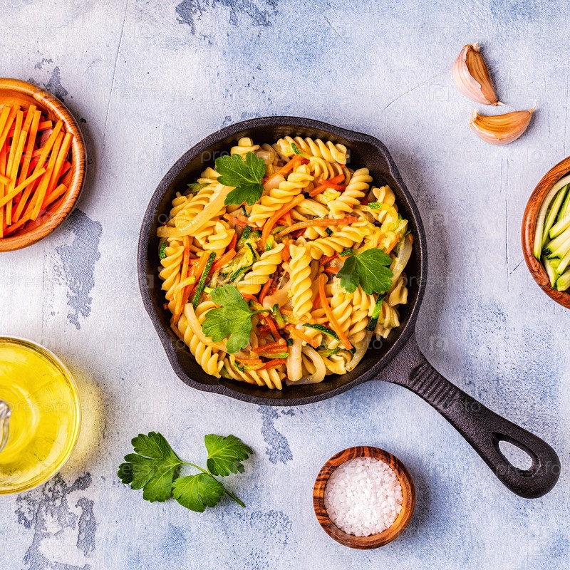 Паста фузилли с кальмарами, цукини и морковью