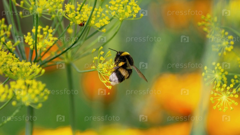 Молодой шмель собирает пыльцу с желтого цветка