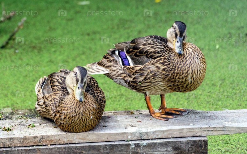 Две молодые утки сидят на деревянном мосту над болотной зеленью