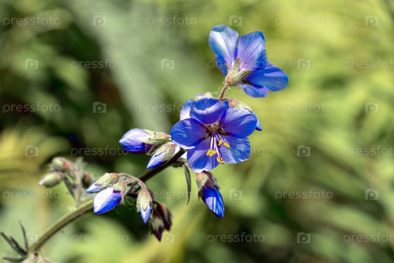 Ветка борвинок с цветами на фоне травы на свету