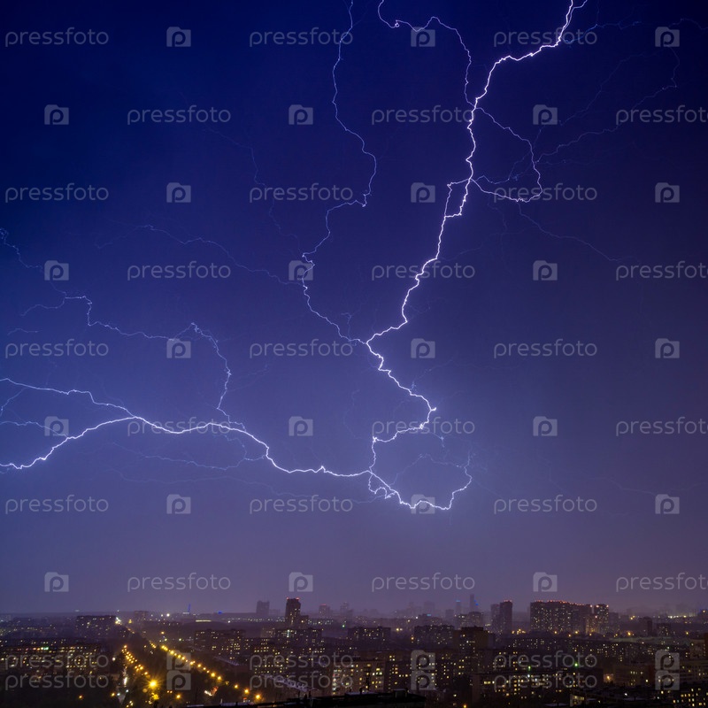 Летом в ночном небе над ночным городом бьют молнии