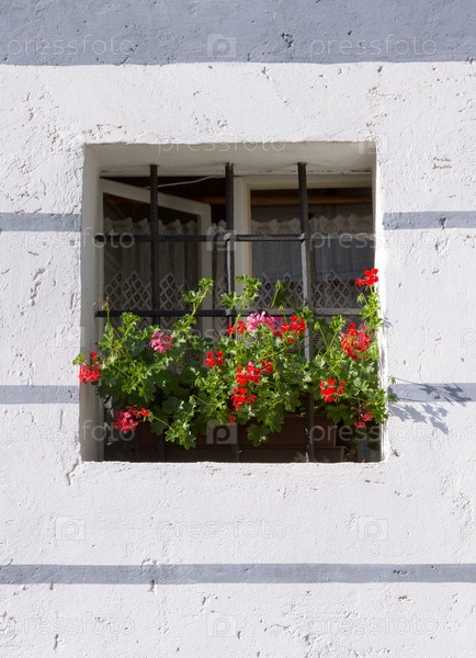 Окно с цветами на стене здания