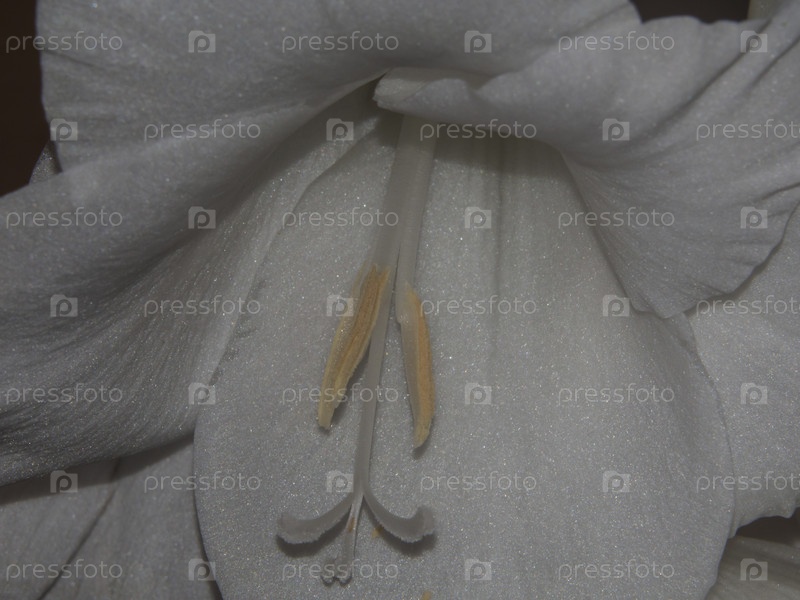 Крупный план белого цветка гладиолуса. Макрофотография цветка с тычинками и пестиками. Абстрактный естественный фон