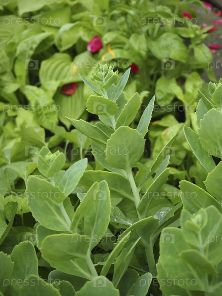 Крупный план сочных зеленых листьев молодых садовых растений весной. Красивый фон природы