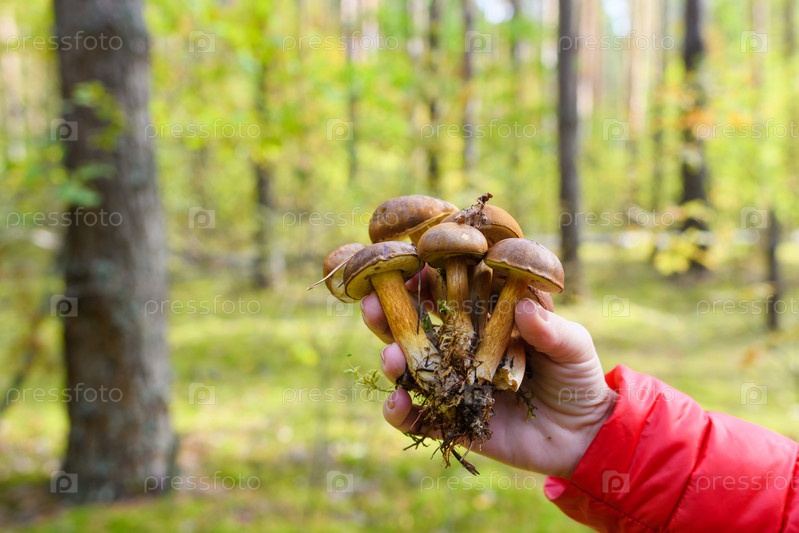 Много красивых свежих грибов в руке на фоне соснового леса. Ножки грибов с остатками мха и земли. Выборочная фокусировка