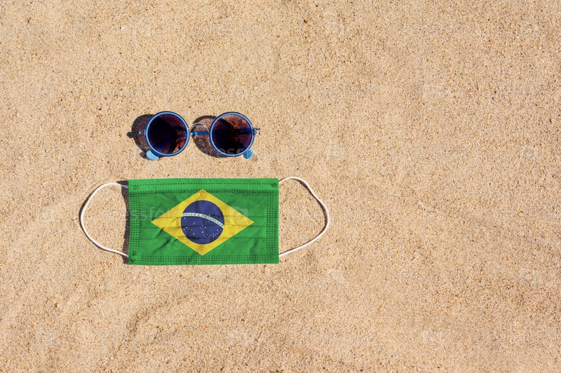Медицинская маска цвета бразильского флага лежит на песчаном пляже рядом с очками. Концепция организации безопасного пляжного отдыха в Бразилии в период пандемии коронавируса