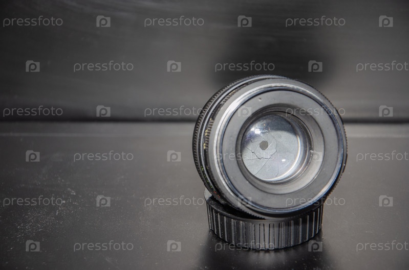 Черный объектив камеры лежит на стеклянном столе. Оборудование фотографа на черном фоне