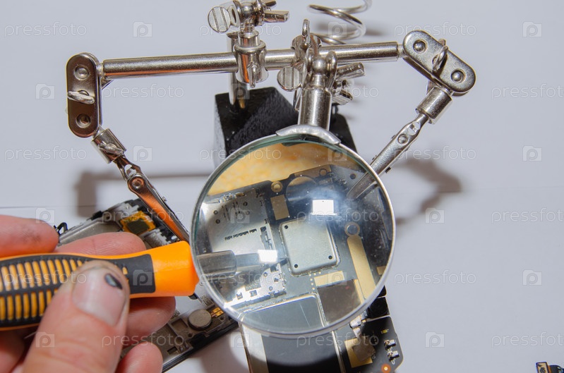 Ремонтирует телефон и рассматривает мелкие детали с помощью увеличительного стекла на белом фоне
