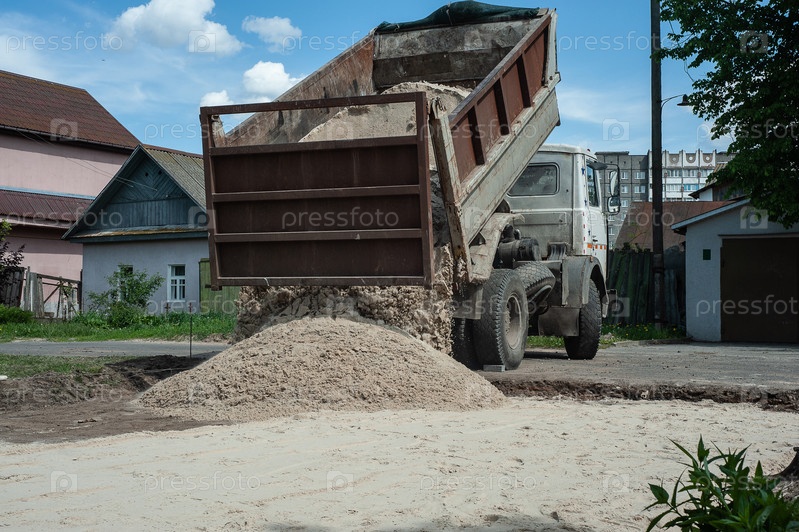Самосвалы хорошо заполняют поле, создавая мелкую почву. Подготовка и строительство