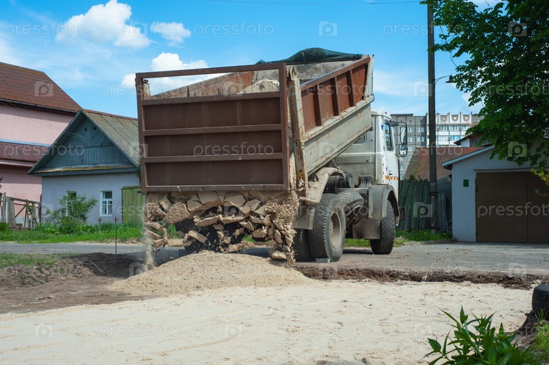 Самосвалы хорошо заполняют поле, создавая мелкую почву. Подготовка и строительство. Город