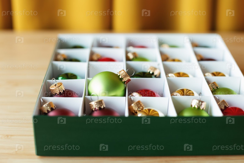 Коробка с елочными игрушками, крупный план. Новый год, Рождество