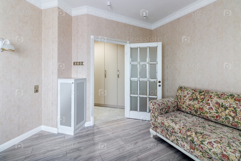 Интерьер стильного дома в светлых тонах с белыми дверями со стеклом