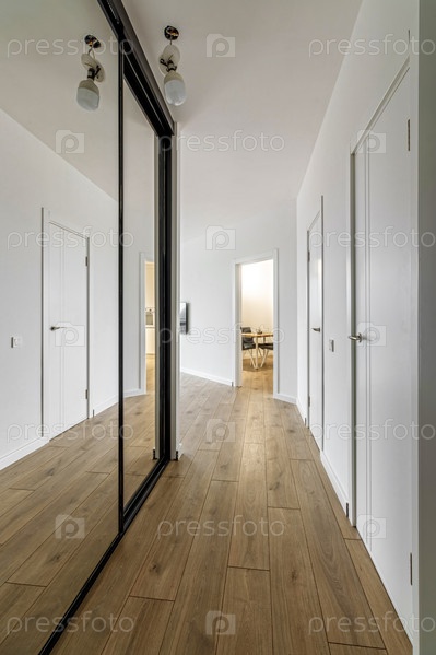 Длинный коридор в интерьере вестибюля современных квартир с дверями, шкафами, полками и зеркалом