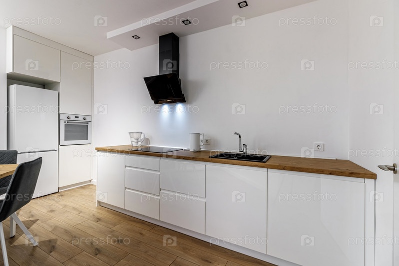 Современный интерьер кухни, деревянная мебель и стильный стол и стулья. Просторное и роскошное пространство в квартире