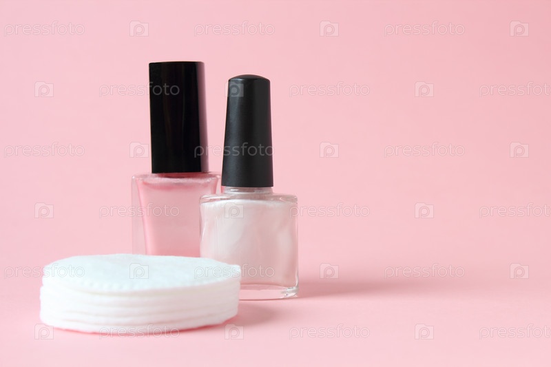 Крупным планом розовые лаки для ногтей и ватные диски на розовом фоне с копировальным пространством. Концепция маникюра и педикюра