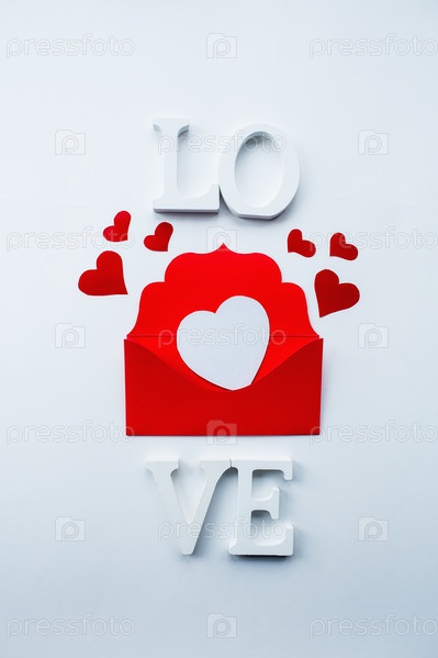 Любовное письмо. Белая открытка в форме сердца с красным бумажным конвертом на белом фоне. Макет для создания открытки на День святого Валентина
