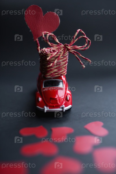 Москва, Россия - январь 2020 г.: Доставка красного ретро игрушечного автомобиля