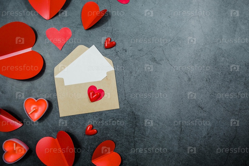 Баннер. Красные сердца, конверт и белый лист бумаги для текста на темном фоне с копией пространства. Концепция праздничного поздравления на день святого Валентина