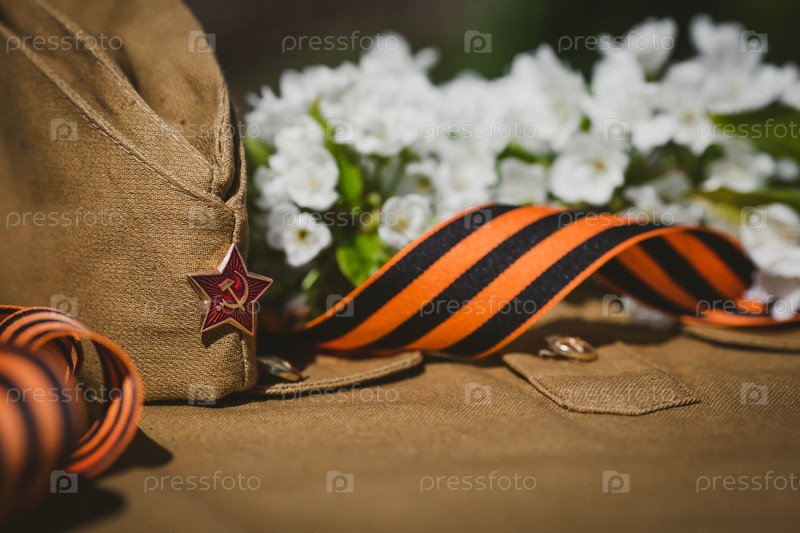 Знамя к 9 Мая. Военная форма, фуражка со звездой, георгиевской лентой и цветком сакуры на заднем плане. Концепция Дня Великой Победы 941-1945 гг. и Дня защитника Отечества