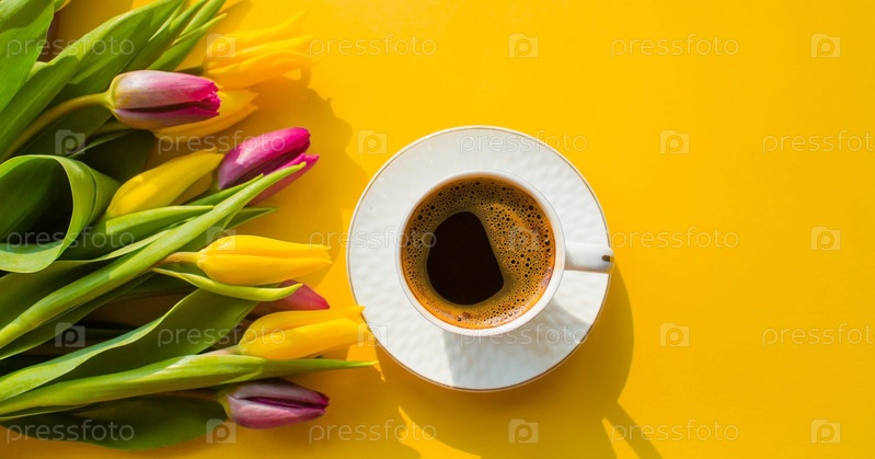 Баннер. Чашка горячего утреннего кофе и букет желто-сиреневых тюльпанов на ярко-желтом фоне. Вид сверху. Крупный план. Скопируйте место для текста. Концепция праздников и пожелания доброго утра