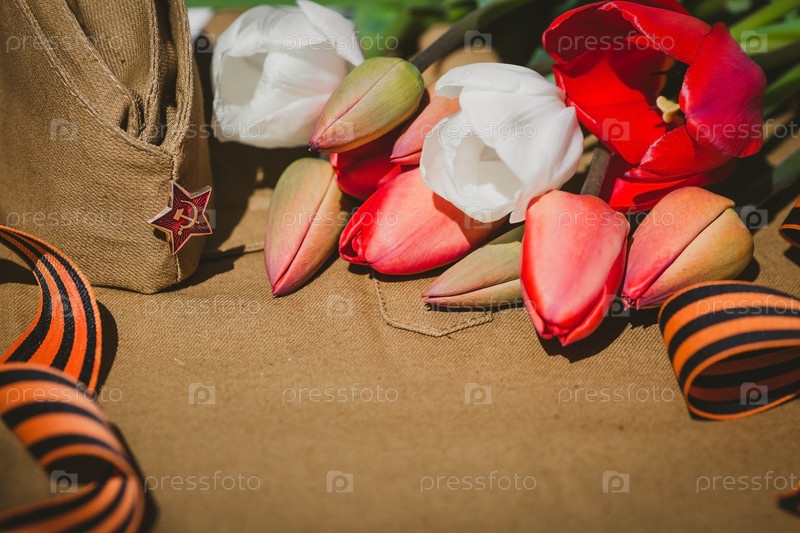 Знамя на 9 мая. Военная форма, фуражка со звездой, георгиевская лента и красные тюльпаны на заднем плане. Концепция Дня Великой Победы 941-1945 гг. и Дня защитника Отечества