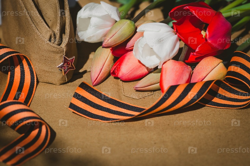 Знамя на 9 мая. Военная форма, фуражка со звездой, георгиевская лента и красные тюльпаны на заднем плане. Концепция Дня Великой Победы 941-1945 гг. и Дня защитника Отечества