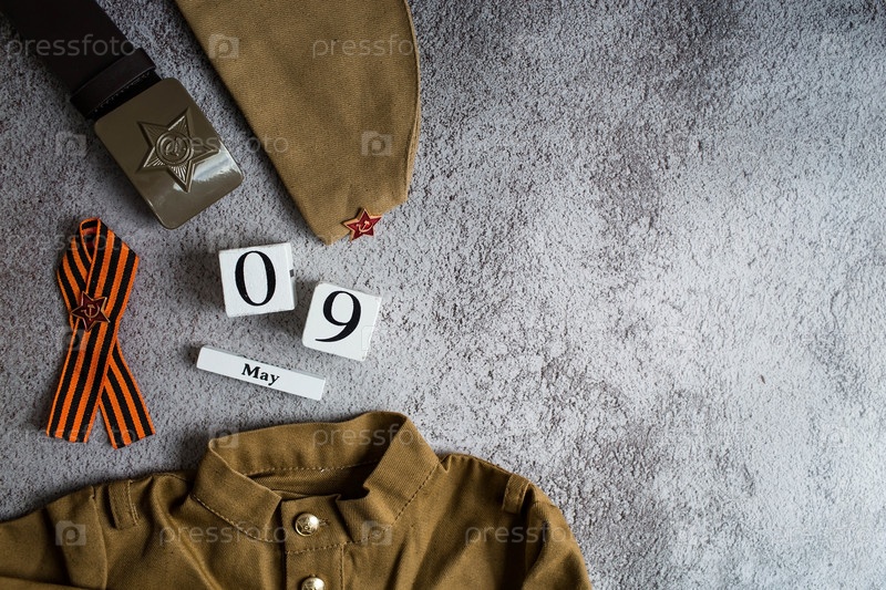 Военная форма, георгиевская лента и деревянный календарь. Концепция Великой Победы 1941-1945 годов и Дня защитника Отечества. Вид сверху. Копия текстового пространства