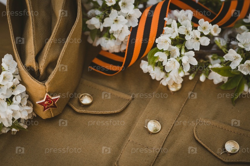 Знамя к 9 Мая. Военная форма, фуражка со звездой, георгиевской лентой и цветком сакуры на заднем плане. Концепция Дня Великой Победы 941-1945 гг. и Дня защитника Отечества