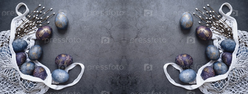 Пасхальная открытка с копией места для текста. Фиолетовые, синие и золотые яйца в авоське на темном фоне. Тенденция 2022 года – фиолетовый оттенок очень пери. Чай каркаде с натуральным красителем. Вид сверху