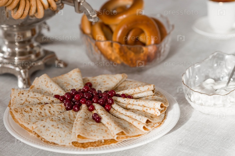 Русские традиции. Русский праздник Масленица. Натюрморт с чашкой чая, стопкой блинов с северной клюквой, кубиками масла и самоварами на столе