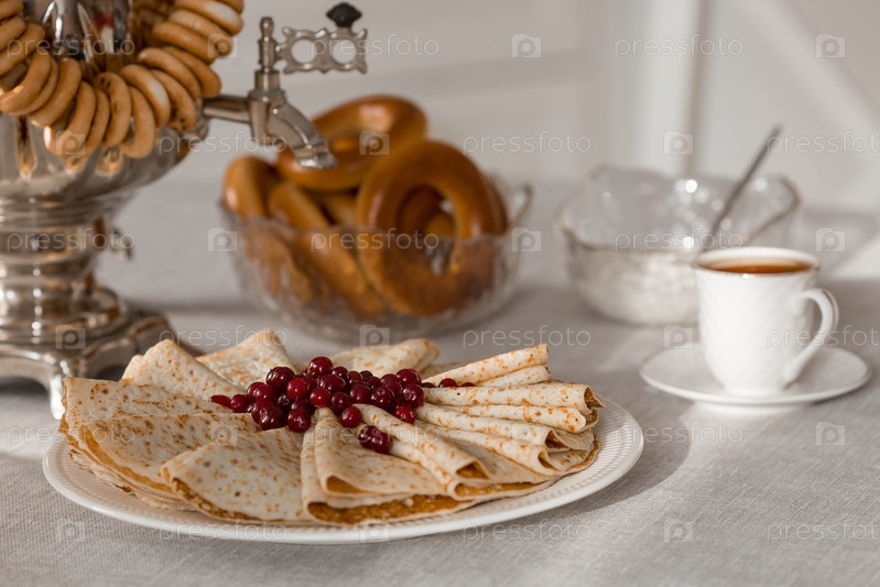 Русские традиции. Русский праздник Масленица. Натюрморт с чашкой чая, стопкой блинов с северной клюквой, кубиками масла и самоварами на столе