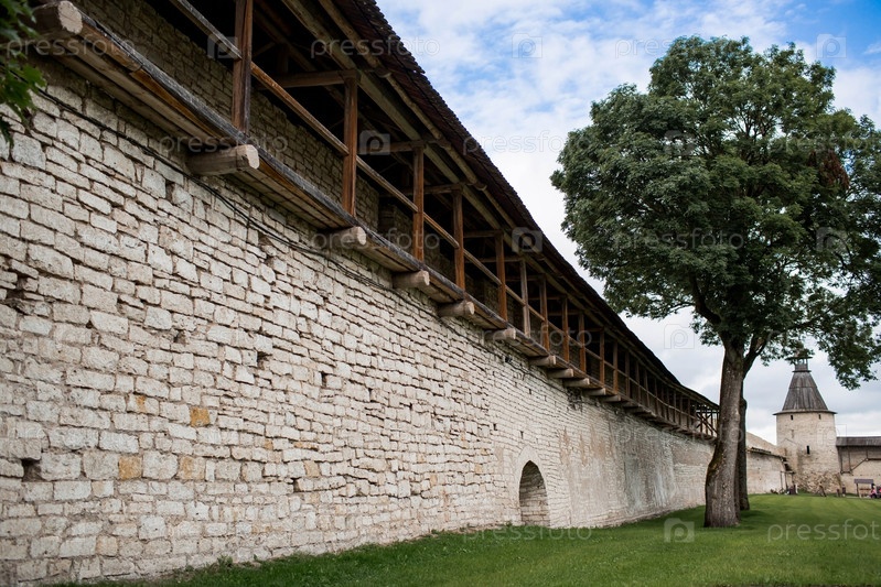 Панорамный вид на средневековый Псковский Кремль на острове в пасмурную погоду, Россия, город. Псков