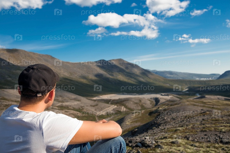 Хибины, между хребтом Пахвумчорр и хребтом Кукисв. Сверху сидит турист-мужчина. Вид на город Кировск
