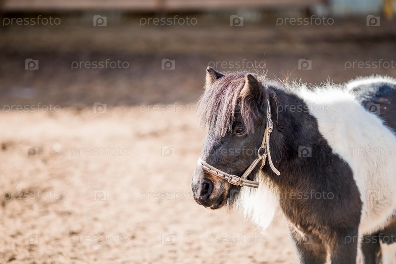 Порода декоративных карликовых лошадей. Милый маленький мини-пони на ферме. Крупный план портрета животного