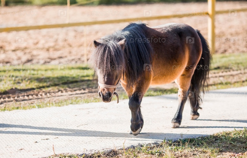 Порода декоративных карликовых лошадей. Милый маленький мини-пони на ферме. Крупный план портрета животного