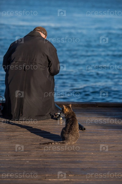 Рыбаки на Графской пристани Севастополя на закате. Кошки ждут улова, чтобы съесть рыбу. Россия, Крым