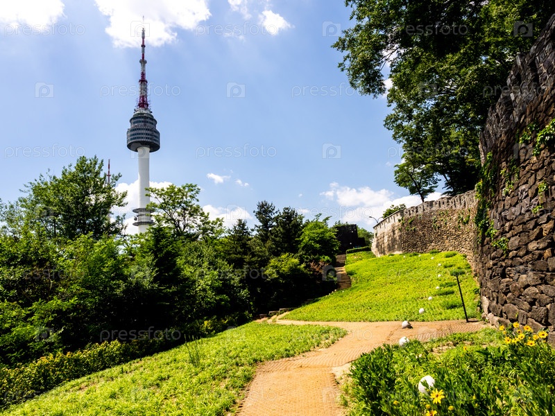 Фрагмент городской стены Сеула, древней исторической каменной стены и башни Намсан, парк Намсан в Южной Корее