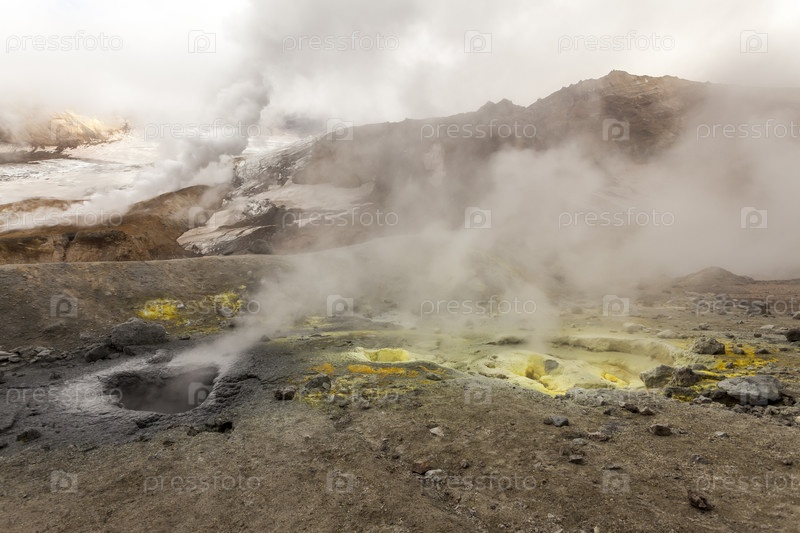 Дымящиеся, серные, действующие фумаролы у вулкана Мутновский, Камчатка, Россия