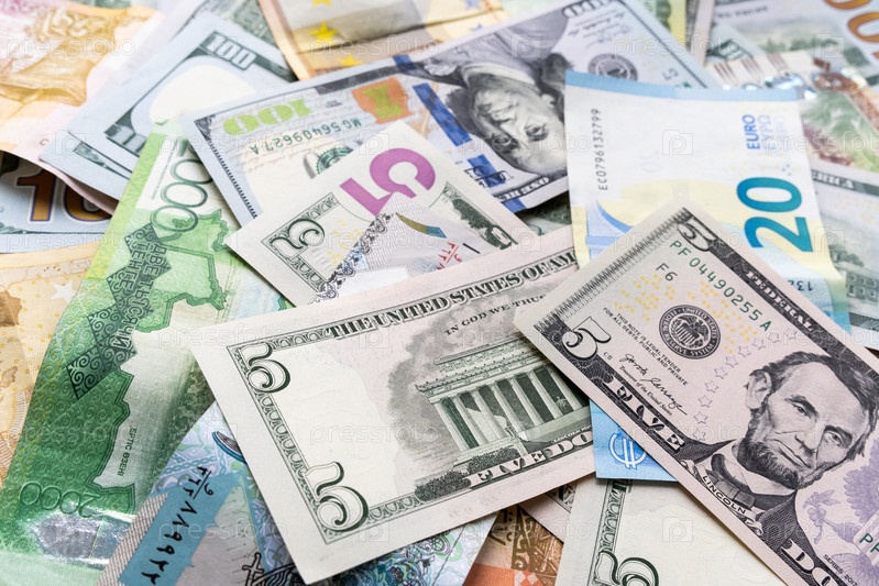 Фон из разных банкнот долларов, евро, рублей, белорусских рублей и другой валюты. Концепция экономического кризиса и сэкономить деньги