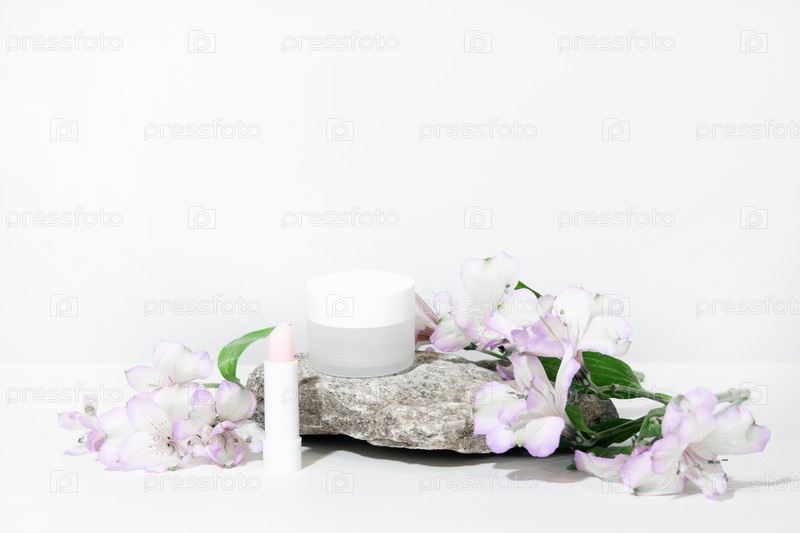 Белый фон косметики. Косметические контейнеры для бутылок с цветочным растением. Пустой пакет этикетки для макета брендинга с жесткими тенями. Концепция натуральных органических косметических продуктов. Баннер