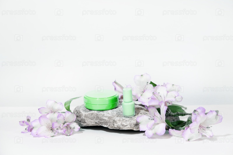 Белый фон косметики. Косметические контейнеры для бутылок с цветочным растением. Пустой пакет этикетки для макета брендинга с жесткими тенями. Концепция натуральных органических косметических продуктов
