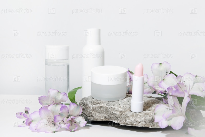 Белый фон косметики. Косметические контейнеры для бутылок с цветочным растением. Пустой пакет этикетки для макета брендинга с жесткими тенями. Концепция натуральных органических косметических продуктов
