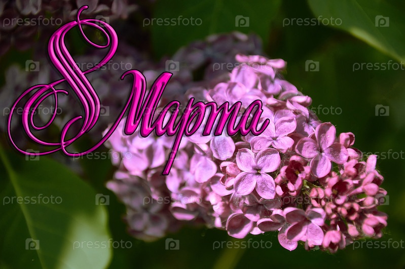 Открытка к 8 марта на фоне цветущей сирени