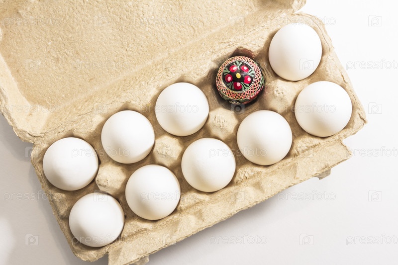 Пасхальное яйцо ручной работы, украшенное народной культурой, упаковано в переработанную картонную коробку среди белых простых яиц. скоро пасха