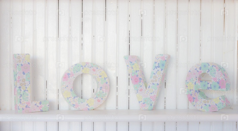 Украшенные цветами буквы, образующие слово ЛЮБОВЬ на полке, деревянный фон, мягкий фокус, фото в высоком ключе
