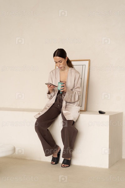 Молодая красивая женщина позирует в бежевой рубашке в студии