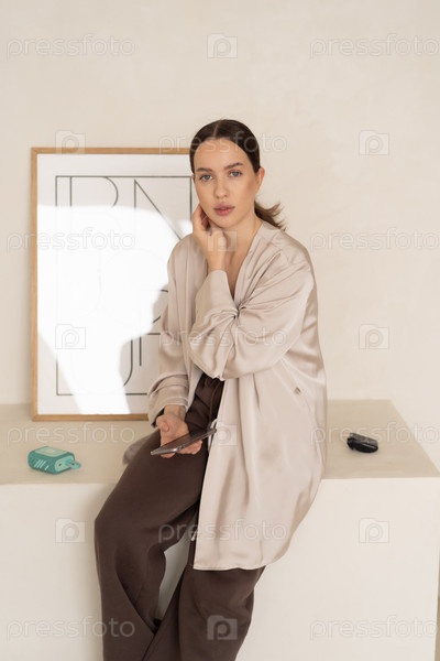 Молодая красивая женщина позирует в бежевой рубашке в студии