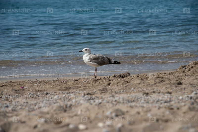 Одинокая чайка на пляже в Пальма-де-Майорка