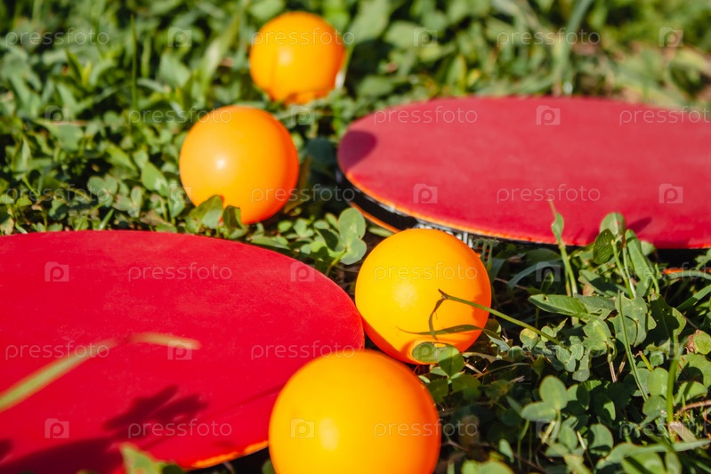 4 оранжевых мяча и две красные ракетки для настольного тенниса лежат на зеленой траве. Крупный план