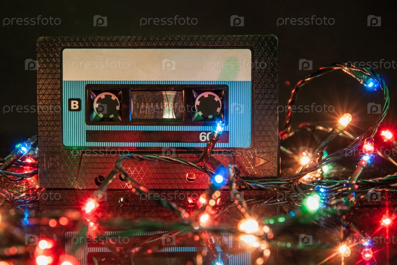 Аудиокассета в черном пластиковом футляре, окруженная разноцветными гирляндами